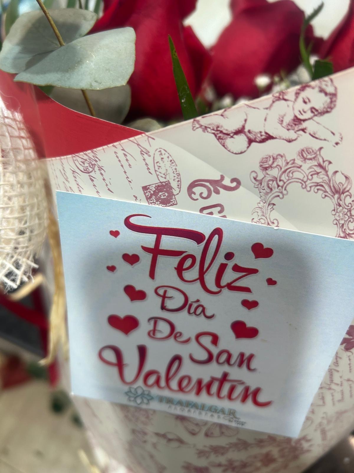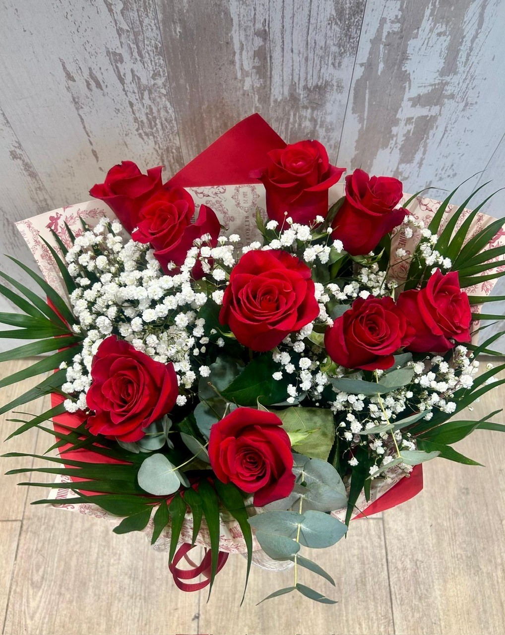Ramo redondeado, composición con 9 rosas rojas, relleno de verdes variados, paniculata y hoja de base.