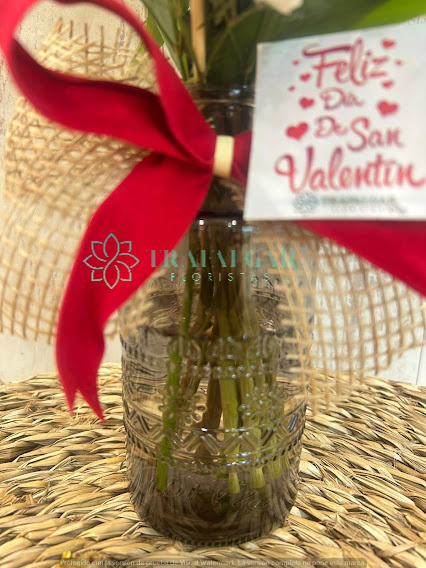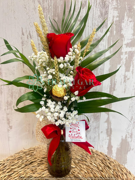 Jarrón de cristal con 2 rosas rojas y verdes variados, detalles de bombón Ferrero Rocher.