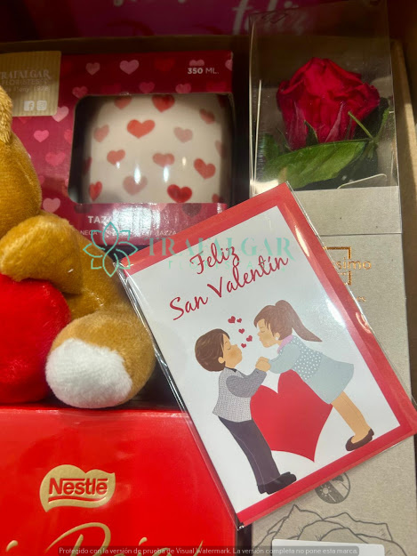 Cajita de cartón compuesta por una rosa roja preservada, taza desayuno, osito de peluche, tarjeta San Valentín y cajita de bombones.