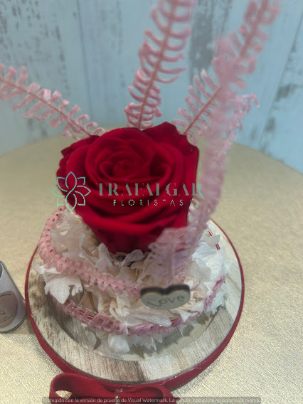 Preciosa cúpula de cristal con rosa roja preservada decorada con fondo de hortensia preservada.