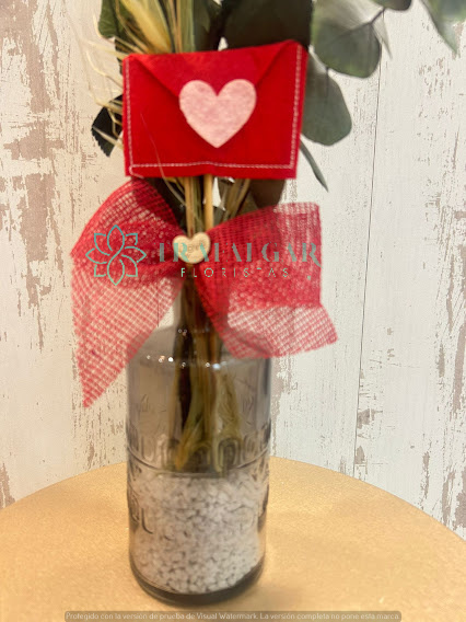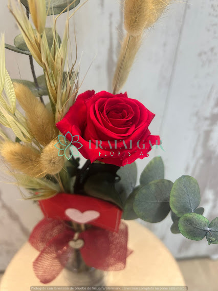 Jarrón de cristal compuesto con una rosa preservada roja y relleno de eucalipto y ramajes.