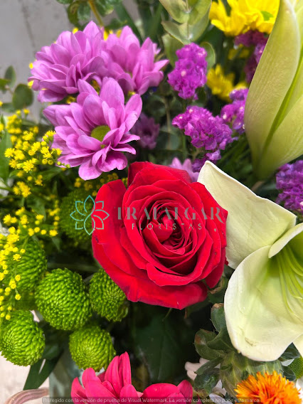 Ramo de flores redondo compuesto de distintas flores variadas y 2 rosas rojas.